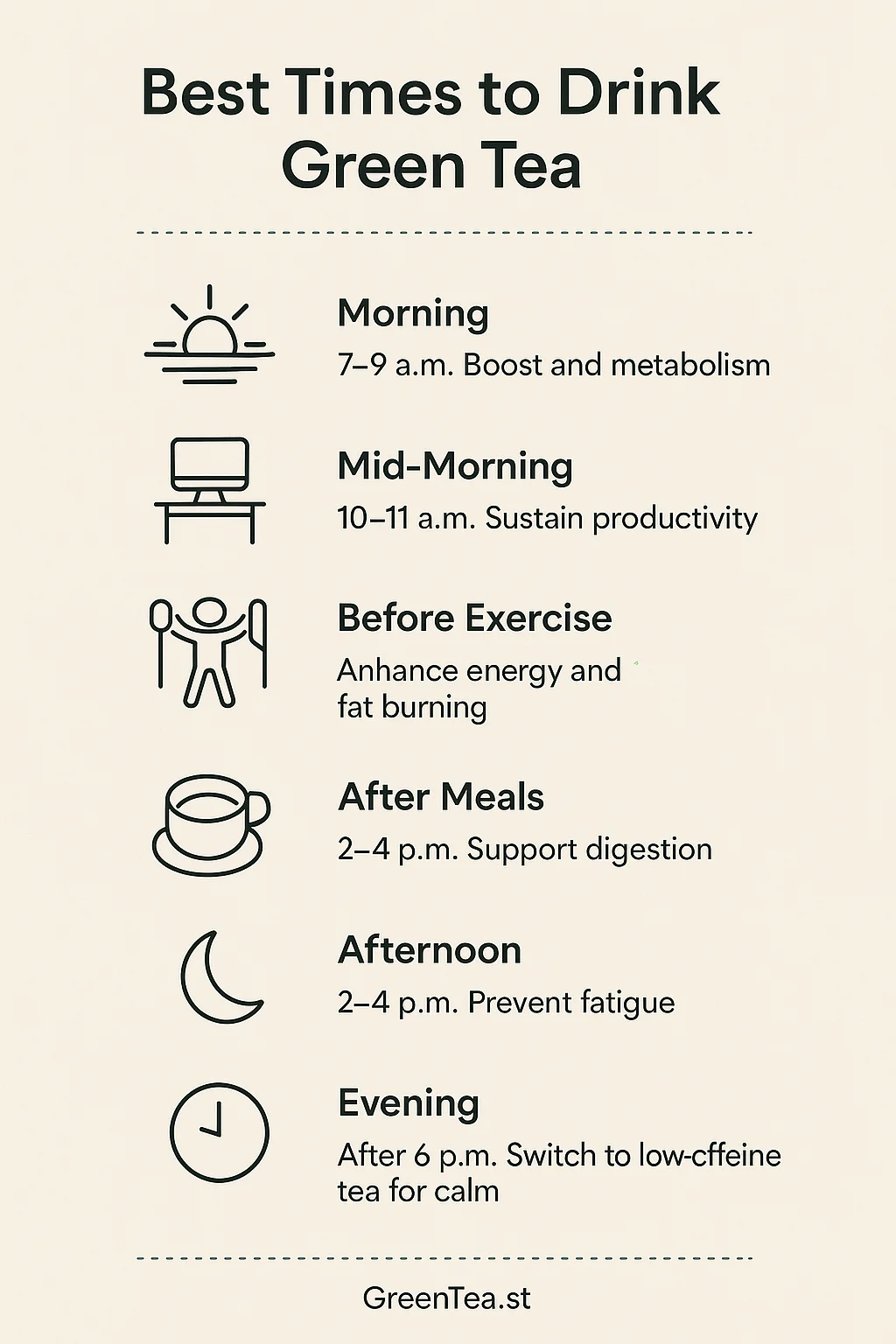 Mid-morning is an ideal window for green tea. By this time, your body has digested breakfast, and your energy levels may begin to dip slightly. The combination of caffeine and L-theanine enhances focus, memory, and alertness, helping maintain productivity through late morning tasks.