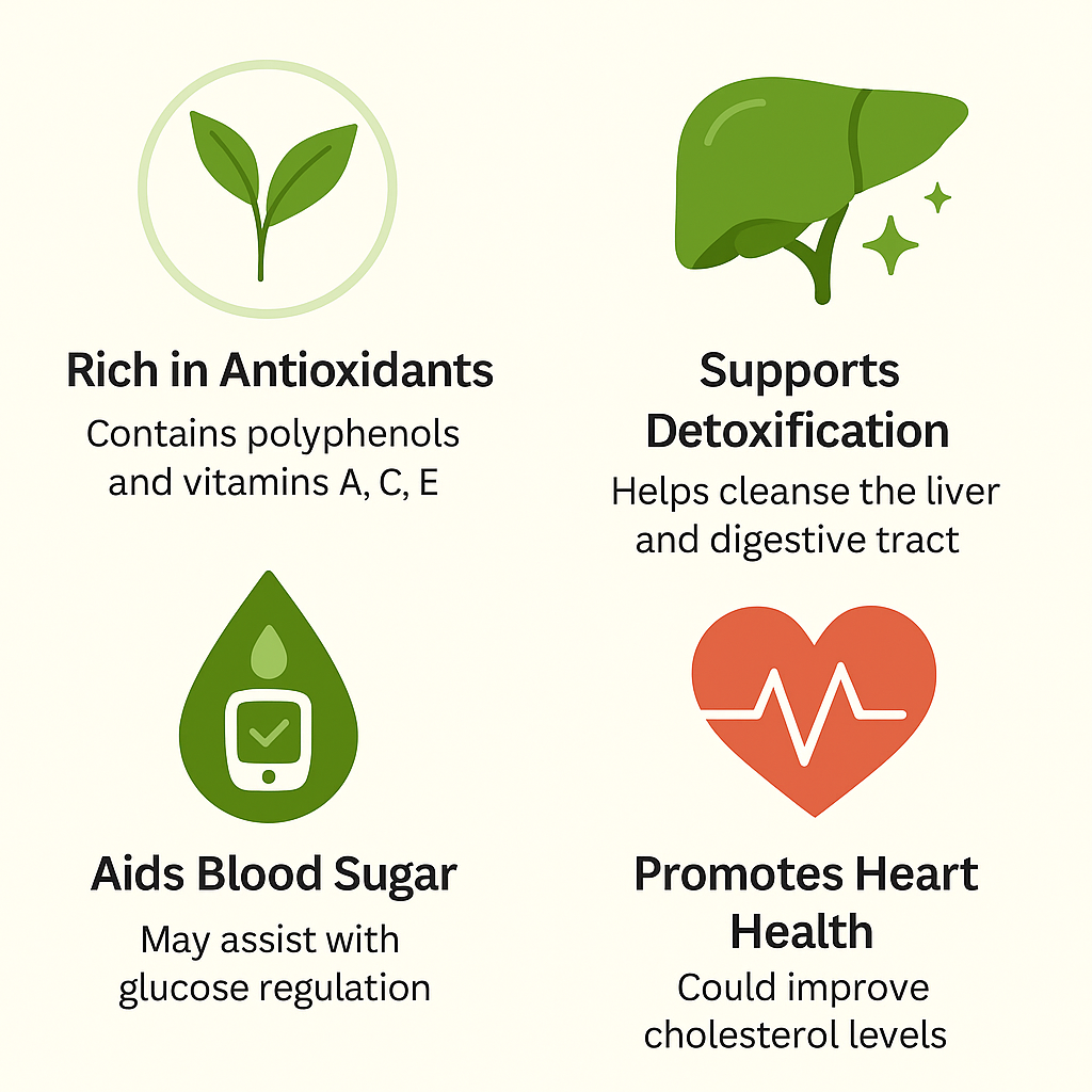 Unlike nutrient-dense foods, the tea infusion does not provide large amounts of macronutrients. Instead, its primary value lies in delivering soluble phytochemicals that help protect the body from oxidative stress, regulate metabolism, and support immunity. The presence of alkaloids and glycosides also explains its traditionally noted bitter taste, which is often associated with detoxifying effects in herbal medicine (3).