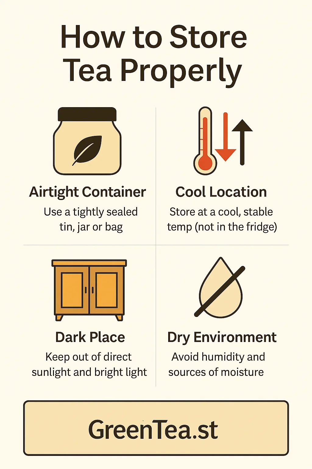 • Avoid keeping tea near the stove, oven, or dishwasher — these areas are warm and humid.