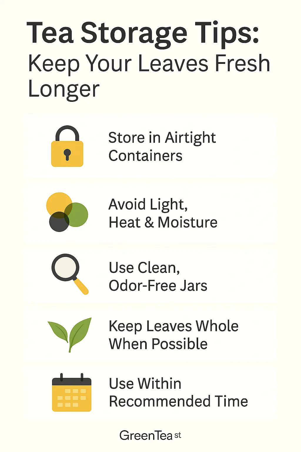 Research shows that improper storage at high temperatures significantly reduces chlorophyll and catechin content in green tea, lowering both taste and antioxidant value (4).