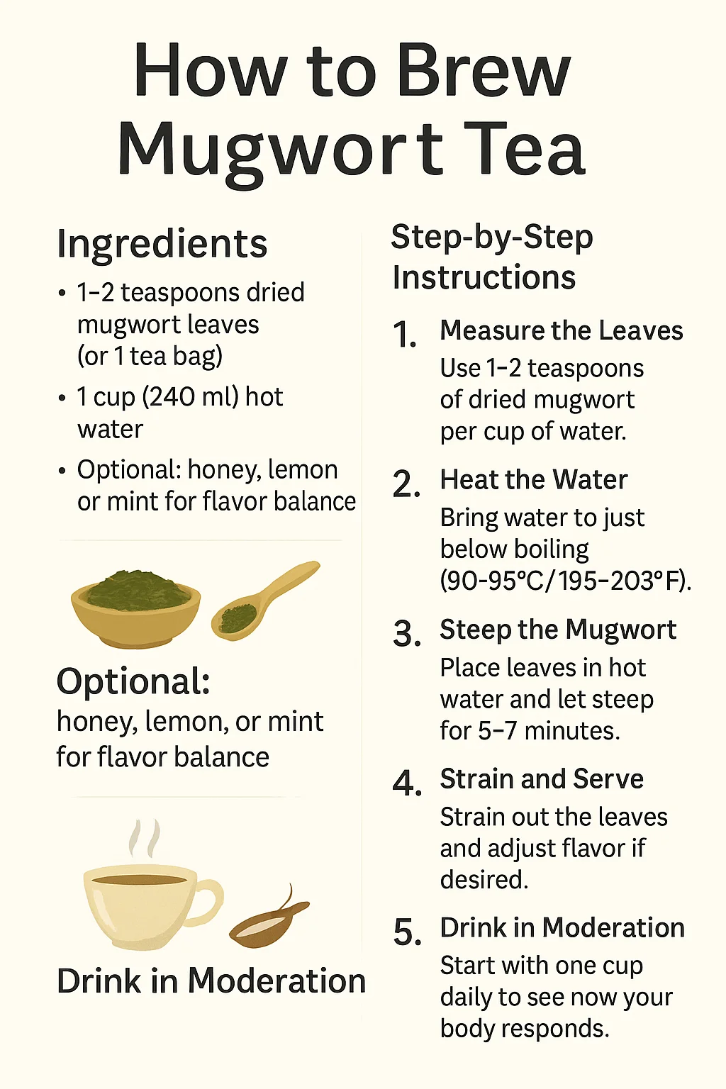 - Drink in Moderation • Start with one cup daily to see how your body responds. Because mugwort has strong bioactive compounds, moderation is key.